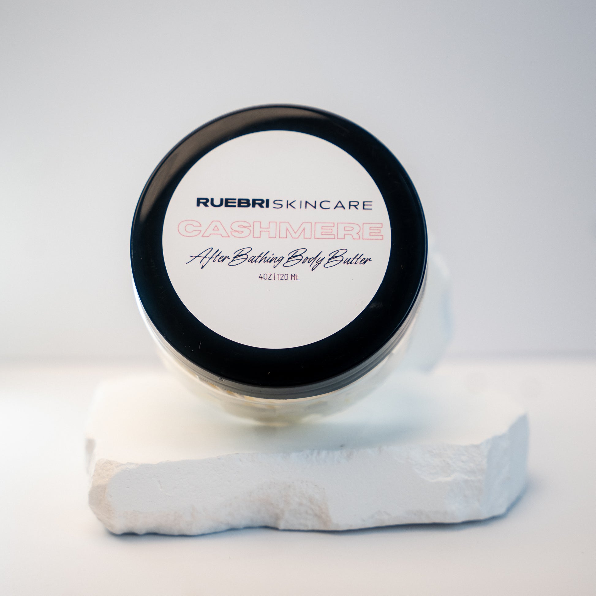 Full 4 oz size jar of whipped Nilotica Shea butter and a matching fragrance spray specially crafted by RueBri Skin Care in the soft warm fragrance of Cashmere. With creamy notes of vanilla and Sandlewood and a touch of powdery musk. .